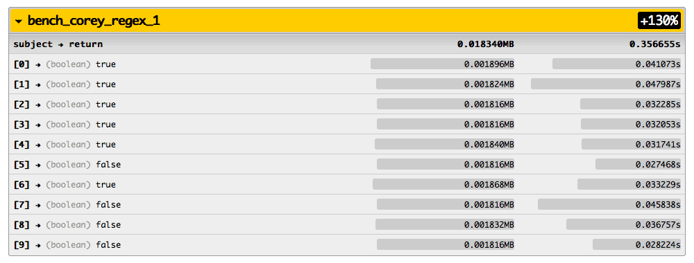 Being able to compare the speed of an arbitrary amount of regular expressions would be tremendously useful. In case you are wondering—yes, I had been writing down benchmark times for each regex, uncommenting them one by one. You get the idea. Those days should be gone forever now.